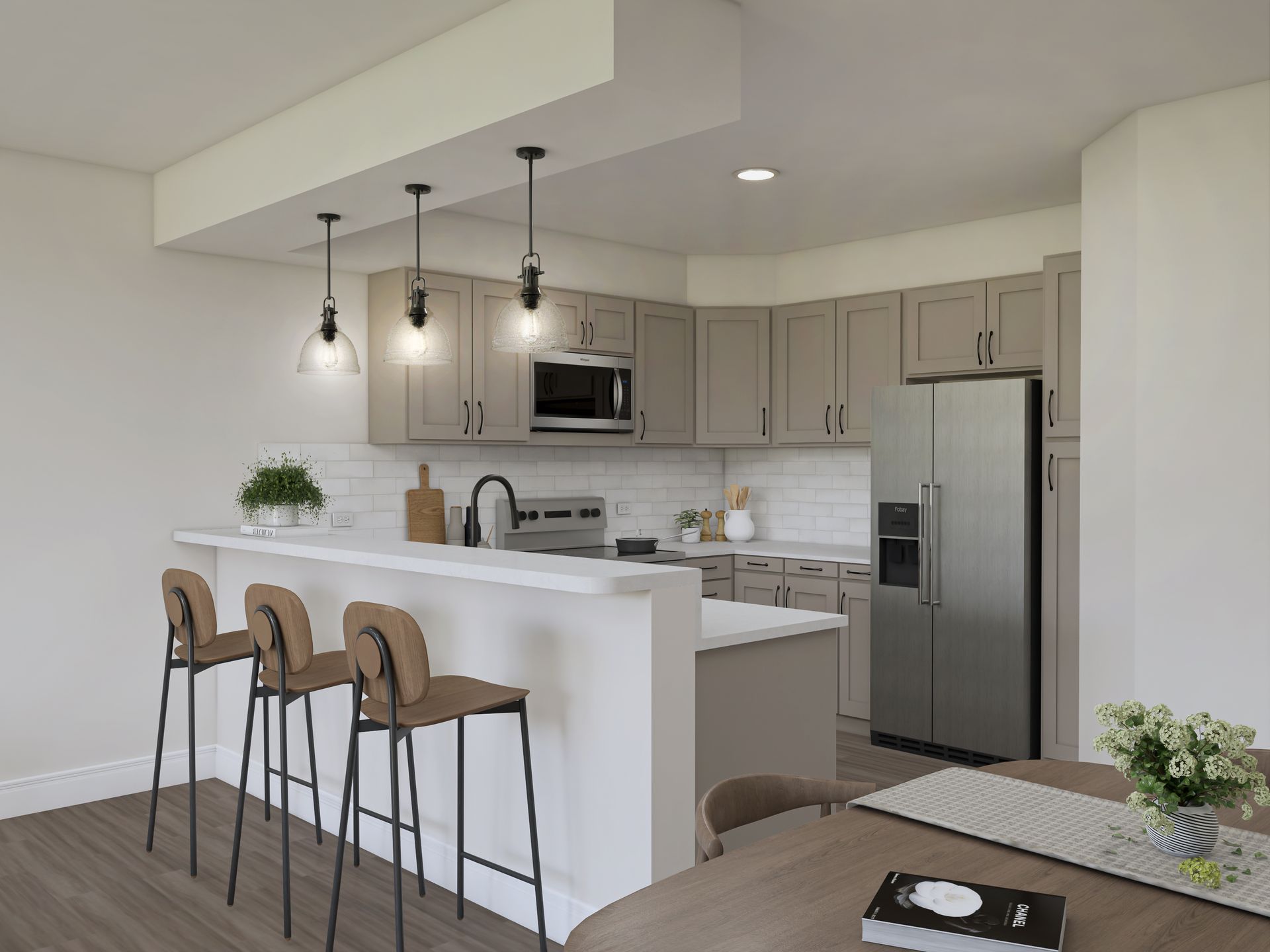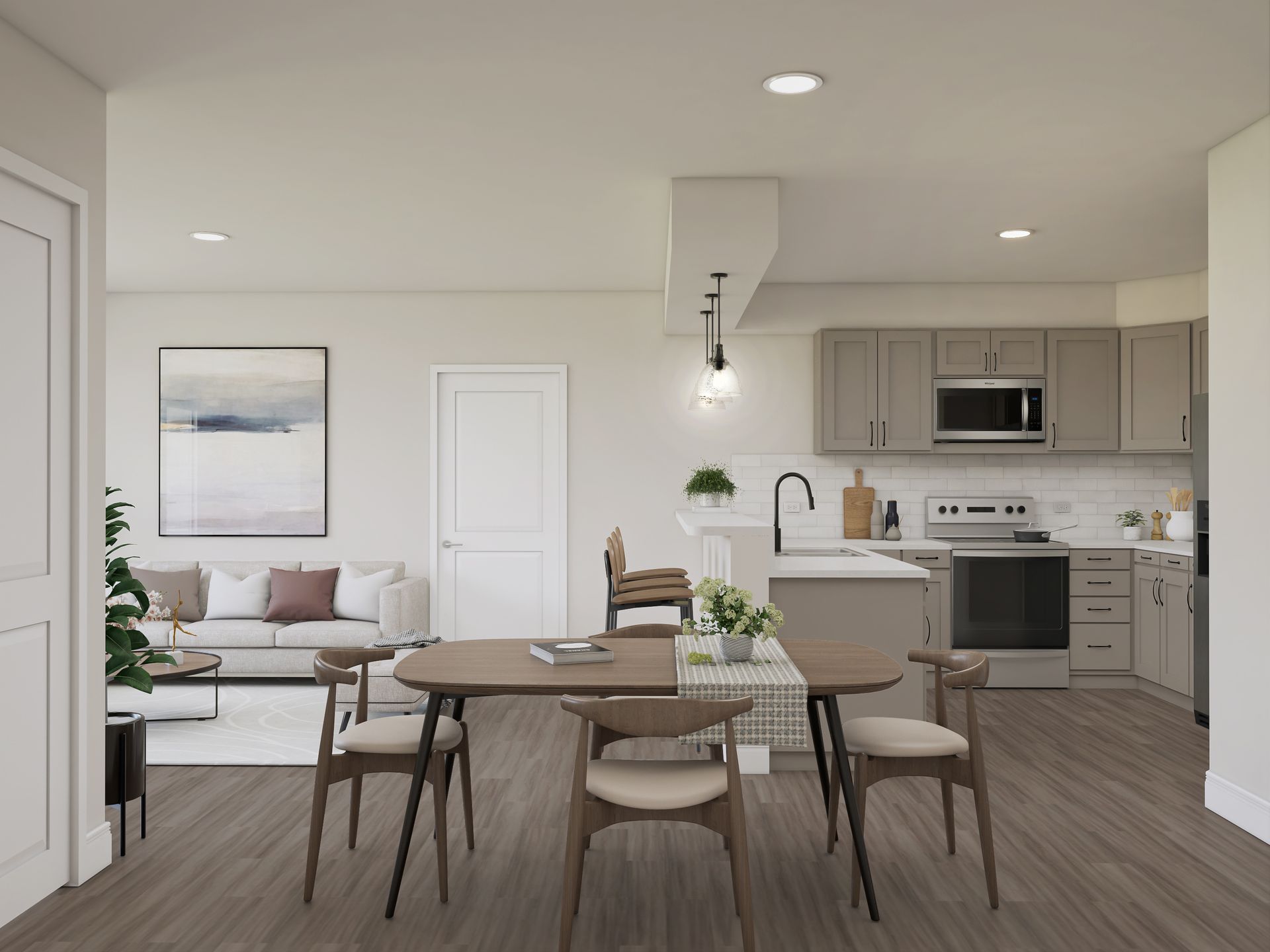 Goldfinch units are single-level residences near the ends of the building. They are beautifully finished with professionally curated interior design packages. Each home has been uniquely tailored with quality selections of cabinet styles and colors, quartz countertops, luxury vinyl plank flooring, pendent lighting and other fixtures to offer upscale living experiences.