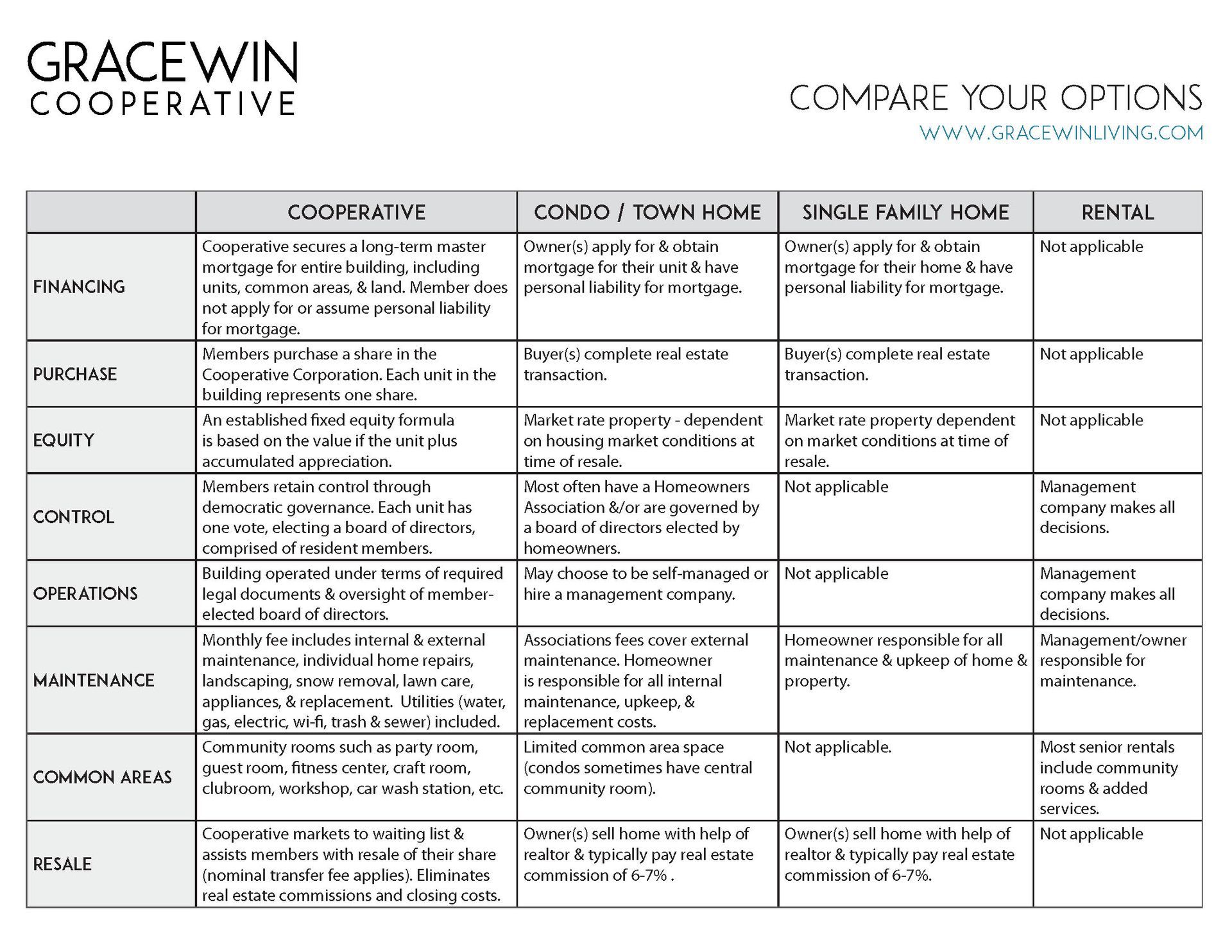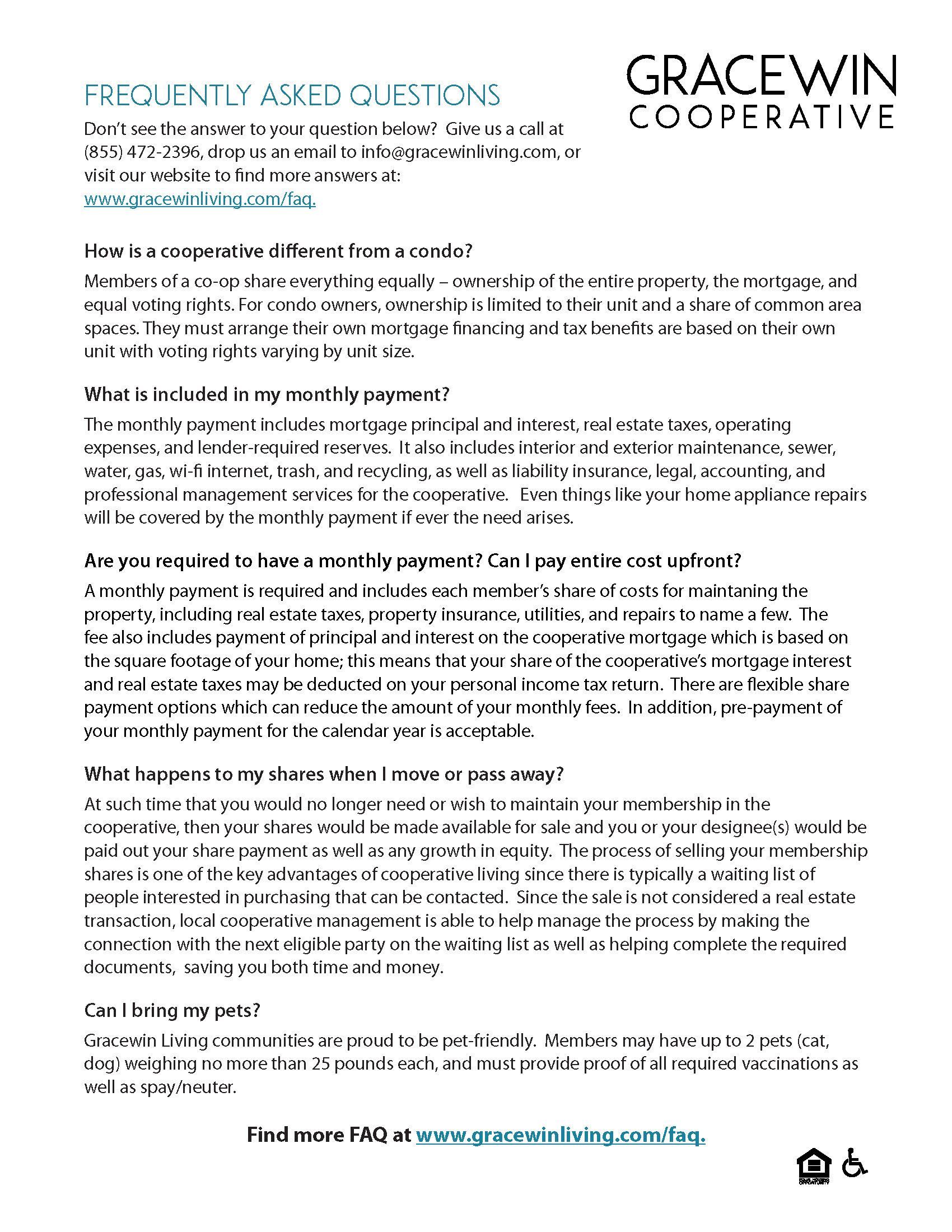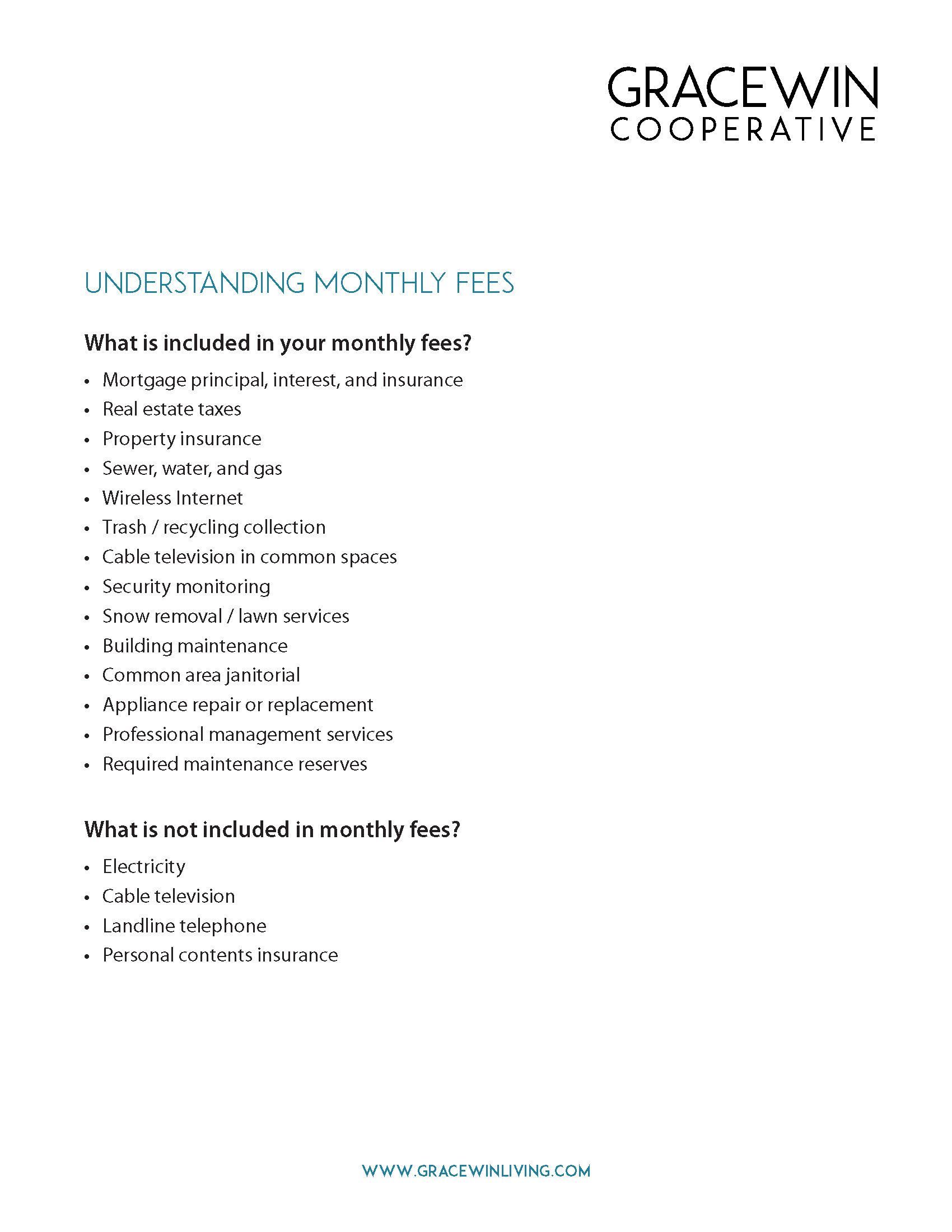 Gracewin offers tiered pricing options for the initial share payment. The more paid at initial investment, the lower the subsequent monthly fee. The monthly fees are all-inclusive and include the members' share of the master mortgage, property taxes, insurance, most utilities, and maintenance. (See printable resources below for breakdown) This monthly fee is reviewed annually and adjusted for actual expenses incurred by the cooperative. - Subsequent resale of member share is simple!